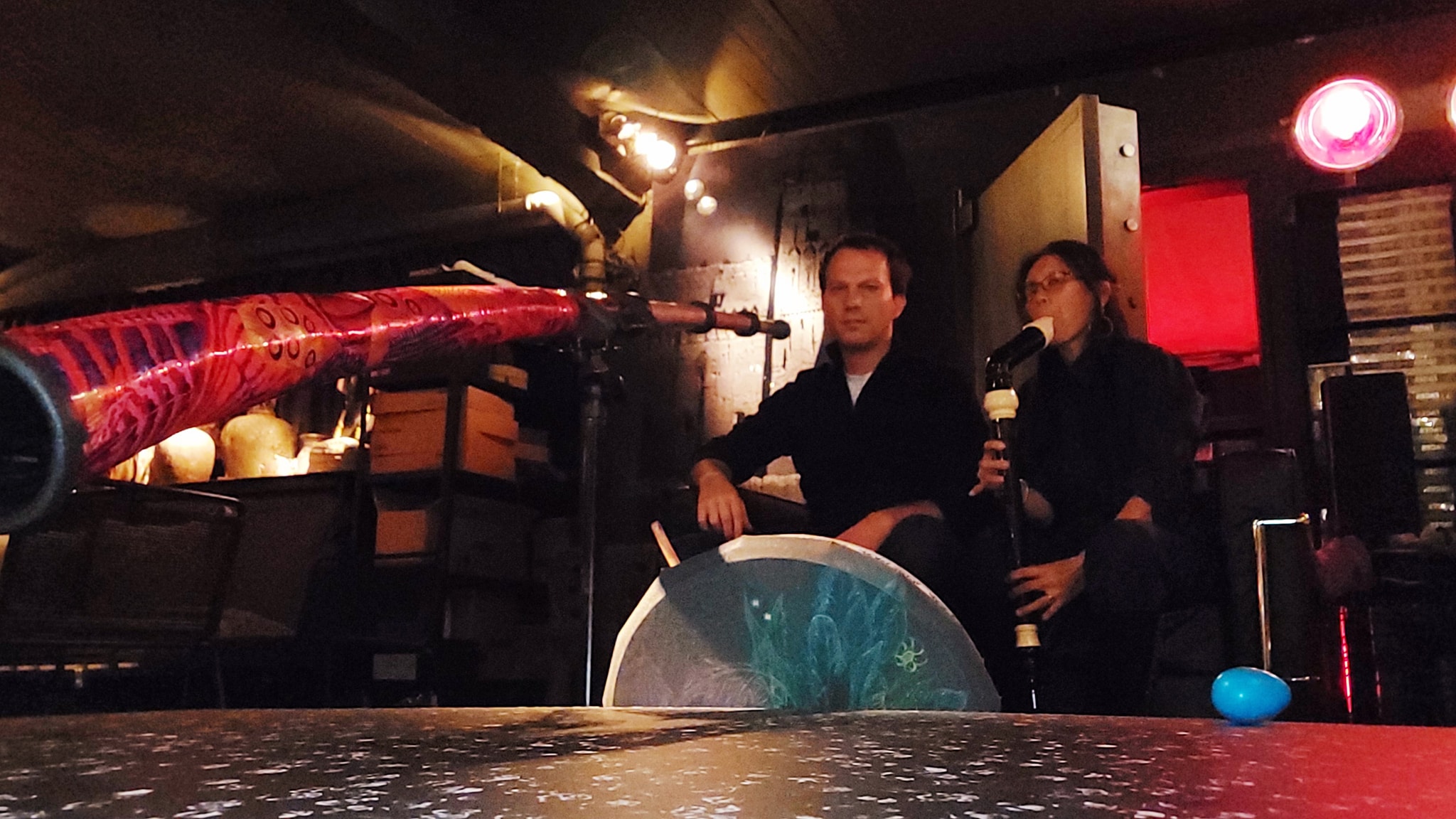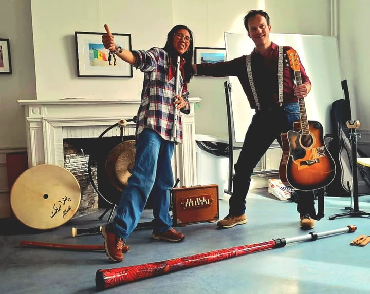 Mike & Tenzen, c’est un duo d’auteurs-compositeurs qui fait du didgeridoo le cœur battant de leurs créations, tout en l’entourant d’une richesse instrumentale étonnante : guitare, bouzouki irlandais et grec, flûtes variées, tambour chamanique, shruti box, mélodica, gong, bols tibétains, erhu, kalimba, guimbardes, asalatos… Chaque instrument apporte sa couleur, sa vibration et son histoire.